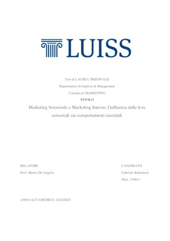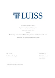 Barbonetti, Gabriele (A.A. 2024/2025) Marketing sensoriale e marketing interno: l'influenza delle leve sensoriali sui comportamenti aziendali. Tesi di Laurea in Marketing, Luiss Guido Carli, relatore Matteo De Angelis, pp. 140. [Bachelor's Degree Thesis]