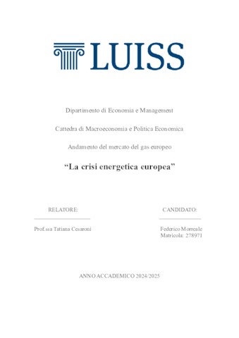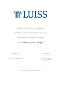 Morreale, Federico (A.A. 2024/2025) La crisi energetica europea. Tesi di Laurea in Macroeconomia e politica economica, Luiss Guido Carli, relatore Tatiana Cesaroni, pp. 47. [Bachelor's Degree Thesis]