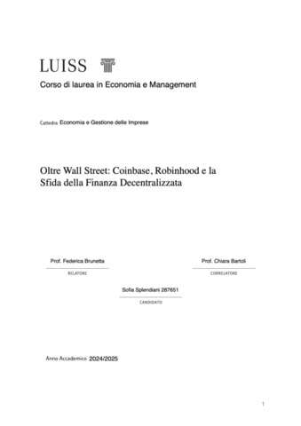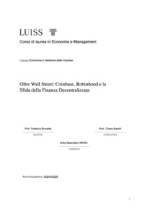 Splendiani, Sofia (A.A. 2024/2025) Oltre Wall Streat: Coinbase, Robinhood e la sfida della finanza decentralizzata. Tesi di Laurea in Economia e gestione delle imprese, Luiss Guido Carli, relatore Federica Brunetta, pp. 184. [Bachelor's Degree Thesis]