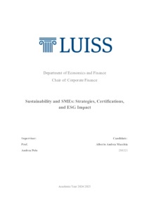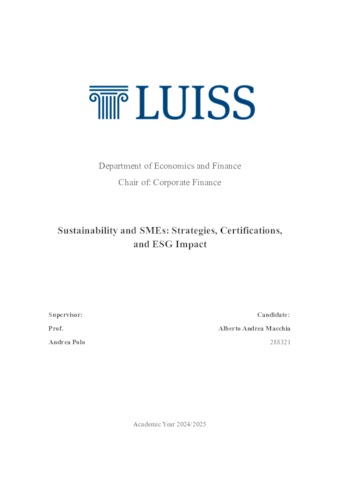 Macchia, Alberto Andrea (A.A. 2024/2025) Sustainability and SMEs: strategies, certifications and ESG impact. Tesi di Laurea in Corporate finance, Luiss Guido Carli, relatore Andrea Polo, pp. 78. [Bachelor's Degree Thesis]