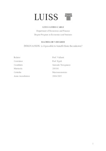 Tavagnacco, Samuele (A.A. 2024/2025) Innovation: is it possible to benefit from the unknown? Tesi di Laurea in Macroeconomics, Luiss Guido Carli, relatore Giovanna Vallanti, pp. 87. [Bachelor's Degree Thesis]