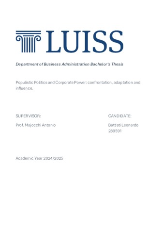 Battisti, Leonardo (A.A. 2024/2025) Populistic politics and corporate power: confrontation, adaptation and influence. Tesi di Laurea in Competitive strategy, Luiss Guido Carli, relatore Antonio Majocchi, pp. 46. [Bachelor's Degree Thesis]