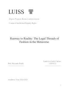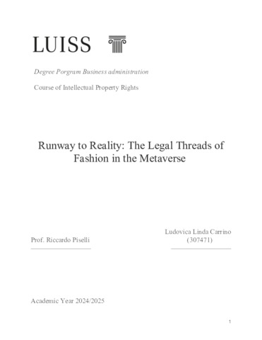 Carrino, Ludovica Linda (A.A. 2024/2025) Runway to reality: the legal threads of fashion in the metaverse. Tesi di Laurea in Intellectual property rights, Luiss Guido Carli, relatore Riccardo Piselli, pp. 104. [Bachelor's Degree Thesis]