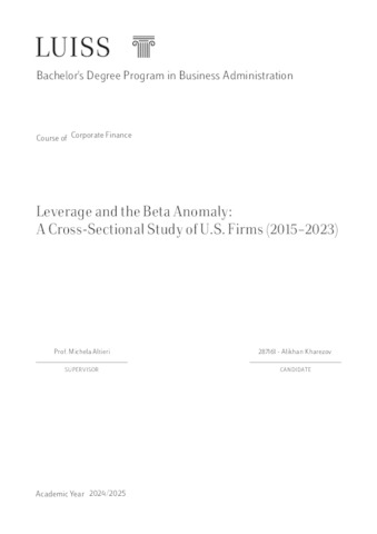 Kharezov, Alikhan (A.A. 2024/2025) Leverage and the beta anomaly: a cross-sectional study of US firms (2015–2023). Tesi di Laurea in Corporate finance, Luiss Guido Carli, relatore Michela Altieri, pp. 43. [Bachelor's Degree Thesis]