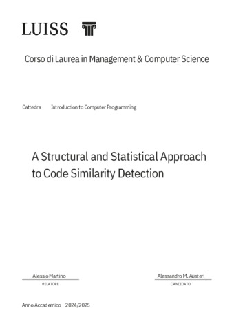 Austeri, Alessandro Maria (A.A. 2024/2025) A structural and statistical approach to code similarity detection. Tesi di Laurea in Introduction to computer programming, Luiss Guido Carli, relatore Alessio Martino, pp. 44. [Bachelor's Degree Thesis]