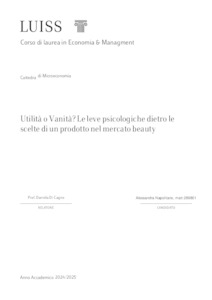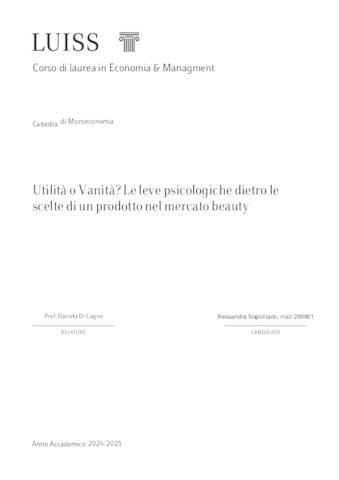 Napolitano, Alessandra (A.A. 2024/2025) Utilità o vanità? Le leve psicologiche dietro le scelte di un prodotto nel mercato beauty. Tesi di Laurea in Microeconomia, Luiss Guido Carli, relatore Daniela Teresa Di Cagno, pp. 102. [Bachelor's Degree Thesis]
