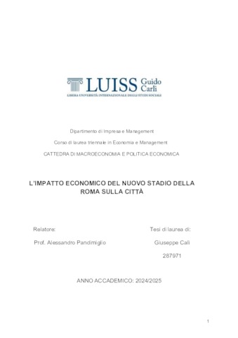 Calì, Giuseppe (A.A. 2024/2025) L'impatto economico del nuovo stadio della Roma sulla città. Tesi di Laurea in Macroeconomia e politica economica, Luiss Guido Carli, relatore Alessandro Pandimiglio, pp. 71. [Bachelor's Degree Thesis]