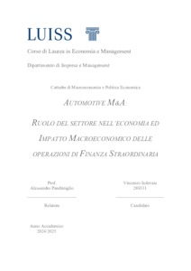 Iadevaia, Vincenzo (A.A. 2024/2025) Automotive M&A: ruolo del settore nell’economia ed impatto macroeconomico delle operazioni di finanza straordinaria. Tesi di Laurea in Macroeconomia e politica economica, Luiss Guido Carli, relatore Alessandro Pandimiglio, pp. 54. [Bachelor's Degree Thesis]