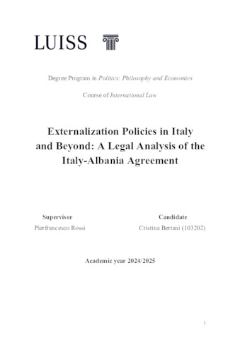 Bertani, Cristina (A.A. 2024/2025) Externalization policies in Italy and beyond: a legal analysis of the Italy-Albania agreement. Tesi di Laurea in International law, Luiss Guido Carli, relatore Pierfrancesco Rossi, pp. 81. [Bachelor's Degree Thesis]