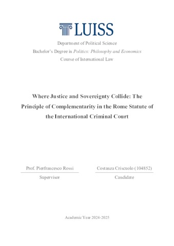 Criscuolo, Costanza (A.A. 2024/2025) Where justice and sovereignty collide: the principle of complementarity in the Rome statute of the international criminal Court. Tesi di Laurea in International law, Luiss Guido Carli, relatore Pierfrancesco Rossi, pp. 73. [Bachelor's Degree Thesis]