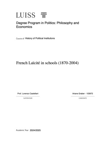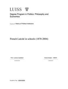 Graber, Ariane (A.A. 2024/2025) French Laïcité in Schools (1870-2004). Tesi di Laurea in History of political institutions, Luiss Guido Carli, relatore Lorenzo Castellani, pp. 58. [Bachelor's Degree Thesis]