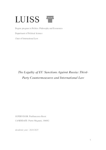 Magnani, Pietro (A.A. 2024/2025) The legality of EU sanctions against Russia: third-party countermeasures and international law. Tesi di Laurea in International law, Luiss Guido Carli, relatore Pierfrancesco Rossi, pp. 90. [Bachelor's Degree Thesis]