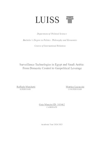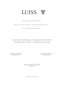 Mancini, Gaia (A.A. 2024/2025) Surveillance technologies in Egypt and Saudi Arabia: from domestic control to geopolitical leverage. Tesi di Laurea in International relations, Luiss Guido Carli, relatore Raffaele Marchetti, pp. 68. [Bachelor's Degree Thesis]
