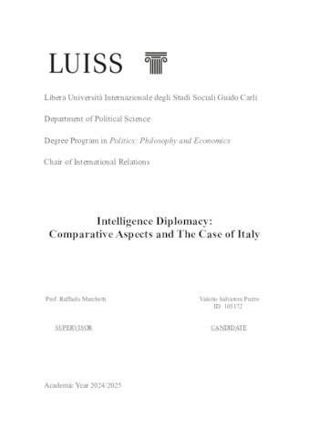 Puzzo, Valerio Salvatore (A.A. 2024/2025) Intelligence diplomacy: comparative aspects and the case of Italy. Tesi di Laurea in International relations, Luiss Guido Carli, relatore Raffaele Marchetti, pp. 80. [Bachelor's Degree Thesis]