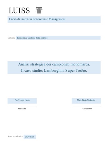 Malassisi, Ilaria (A.A. 2024/2025) Analisi strategica dei campionati monomarca: il caso studio: Lamborghini Super Trofeo. Tesi di Laurea in Economia e gestione delle imprese, Luiss Guido Carli, relatore Luigi Nasta, pp. 114. [Bachelor's Degree Thesis]