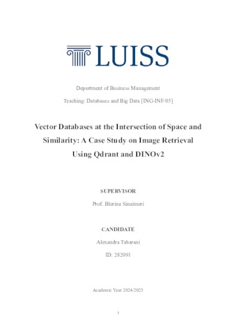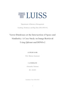 Tabarani, Alexandra (A.A. 2024/2025) Vector databases at the intersection of space and similarity: a case study on image retrieval using Qdrant and DINOv2. Tesi di Laurea in Databases & big data, Luiss Guido Carli, relatore Blerina Sinaimeri, pp. 46. [Bachelor's Degree Thesis]
