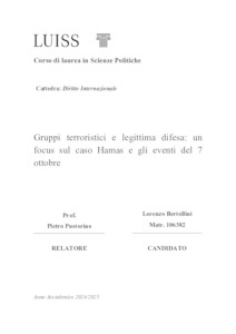 Bertollini, Lorenzo (A.A. 2024/2025) Gruppi terroristici e legittima difesa: un focus sul caso Hamas e gli eventi del 7 ottobre. Tesi di Laurea in Diritto internazionale, Luiss Guido Carli, relatore Pietro Pustorino, pp. 115. [Bachelor's Degree Thesis]