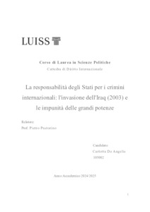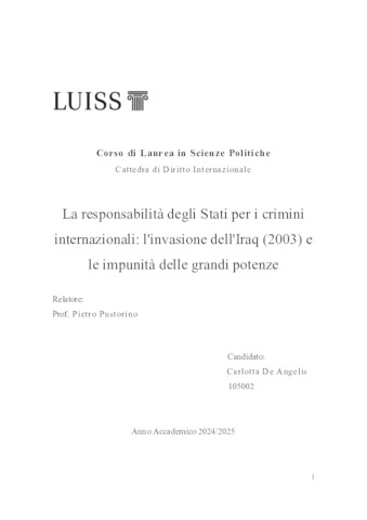 De Angelis, Carlotta (A.A. 2024/2025) La responsabilità degli Stati per i crimini internazionali: l'invasione dell'Iraq (2003) e le impunità delle grandi potenze. Tesi di Laurea in Diritto internazionale, Luiss Guido Carli, relatore Pietro Pustorino, pp. 100. [Bachelor's Degree Thesis]