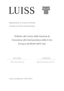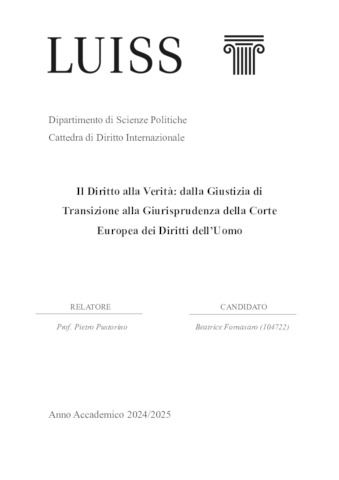 Fornasaro, Beatrice (A.A. 2024/2025) Il diritto alla verità: dalla giustizia di transizione alla giurisprudenza della Corte europea dei diritti dell’uomo. Tesi di Laurea in Diritto internazionale, Luiss Guido Carli, relatore Pietro Pustorino, pp. 98. [Bachelor's Degree Thesis]