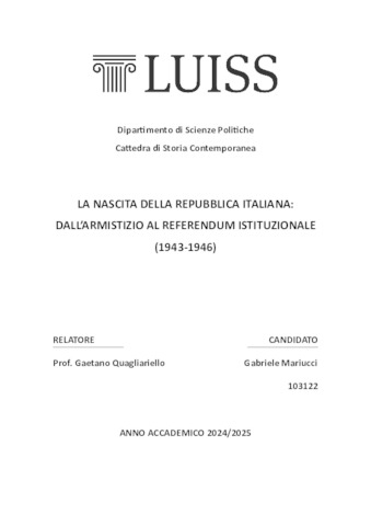 Mariucci, Gabriele (A.A. 2024/2025) La nascita della Repubblica italiana: dall’armistizio al referendum istituzionale (1943-1946). Tesi di Laurea in Storia contemporanea, Luiss Guido Carli, relatore Gaetano Quagliariello, pp. 79. [Bachelor's Degree Thesis]