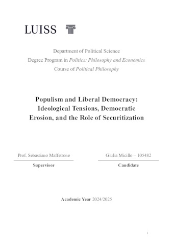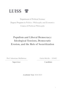 Micillo, Giulia (A.A. 2024/2025) Populism and liberal democracy: ideological tensions, democratic erosion and the role of securitization. Tesi di Laurea in Political philosophy, Luiss Guido Carli, relatore Sebastiano Maffettone, pp. 86. [Bachelor's Degree Thesis]