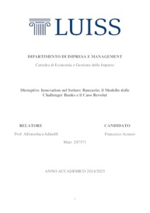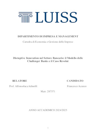 Acunzo, Francesco (A.A. 2024/2025) Disruptive innovation nel settore bancario: il modello delle challenger banks e il caso Revolut. Tesi di Laurea in Economia e gestione delle imprese, Luiss Guido Carli, relatore Alfonsoluca Adinolfi, pp. 123. [Bachelor's Degree Thesis]