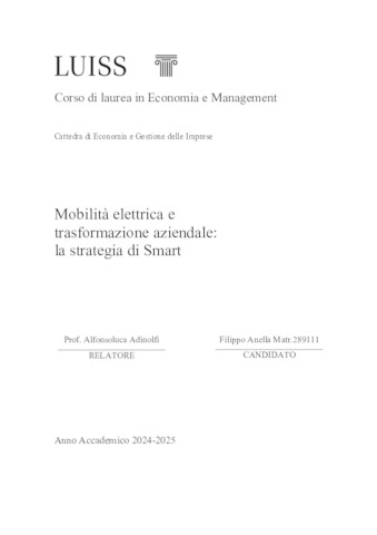 Anella, Filippo (A.A. 2024/2025) Mobilità elettrica e trasformazione aziendale: la strategia di Smart. Tesi di Laurea in Economia e gestione delle imprese, Luiss Guido Carli, relatore Alfonsoluca Adinolfi, pp. 83. [Bachelor's Degree Thesis]