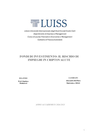 Del Pizzo, Alessandro (A.A. 2024/2025) Fondi di investimento: il rischio di impieghi in criptovalute. Tesi di Laurea in Finanza aziendale, Luiss Guido Carli, relatore Gianluca Mattarocci, pp. 72. [Bachelor's Degree Thesis]