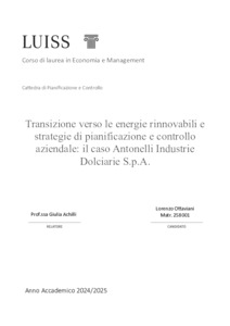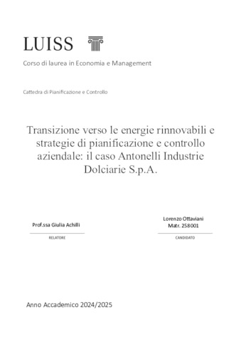 Ottaviani, Lorenzo (A.A. 2024/2025) Transizione verso le energie rinnovabili e strategie di pianificazione e controllo aziendale: il caso Antonelli Industrie Dolciarie S.p.a. Tesi di Laurea in Pianificazione e controllo, Luiss Guido Carli, relatore Giulia Achilli, pp. 32. [Bachelor's Degree Thesis]