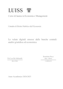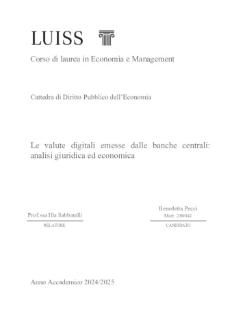 Pecci, Benedetta (A.A. 2024/2025) Le valute digitali emesse dalle banche centrali: analisi giuridica ed economica. Tesi di Laurea in Diritto pubblico dell'economia, Luiss Guido Carli, relatore Illa Sabbatelli, pp. 100. [Bachelor's Degree Thesis]
