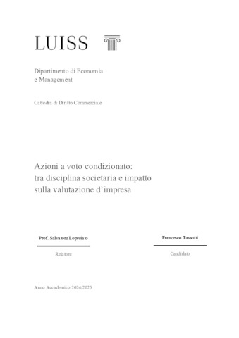 Tassotti, Francesco (A.A. 2024/2025) Azioni a voto condizionato: tra disciplina societaria e impatto sulla valutazione d’impresa. Tesi di Laurea in Diritto commerciale, Luiss Guido Carli, relatore Salvatore Lopreiato, pp. 56. [Bachelor's Degree Thesis]