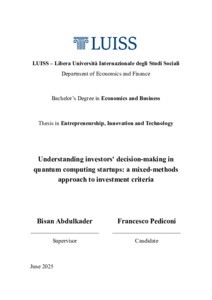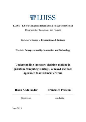 Pediconi, Francesco (A.A. 2024/2025) Understanding investors' decision-making in quantum computing start-ups: a mixed-methods approach to investment criteria. Tesi di Laurea in Entrepreneurship, innovation and technology, Luiss Guido Carli, relatore Bisan Abdulkader, pp. 103. [Bachelor's Degree Thesis]