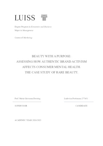 Portincasa, Ludovica (A.A. 2024/2025) Beauty with a purpose: assessing how authentic brand activism affects consumer mental health: the case study of Rare Beauty. Tesi di Laurea in Marketing, Luiss Guido Carli, relatore Maria Giovanna Devetag, pp. 63. [Bachelor's Degree Thesis]