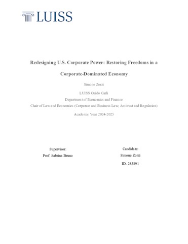 Zorzi, Simone (A.A. 2024/2025) Redesigning US corporate power: restoring freedoms in a corporate-dominated economy. Tesi di Laurea in Law and economics (corporate and business law: antitrust and regulation), Luiss Guido Carli, relatore Sabrina Bruno, pp. 146. [Bachelor's Degree Thesis]