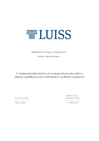 Conti, Emanuel (A.A. 2024/2025) L’asimmetria informativa e le strategie di mercato nell’era digitale: pubblicità, potere informativo e politiche regolatorie. Tesi di Laurea in Microeconomia, Luiss Guido Carli, relatore Luca Vitali, pp. 66. [Bachelor's Degree Thesis]
