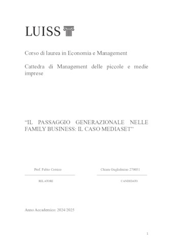 Introduzione al tema del passaggio generazionale nei family business. Definizione dei family business e il loro ruolo nell'economia mondiale. Difficoltà e opportunità legate al passaggio generazionale. Metodo di ricerca utilizzato. Dinamiche e approcci al cambio generazionale. Teorie e modelli relativi al cambio generazionale. Pianificazione della successione e ruoli chiave coinvolti. Formazione e preparazione delle nuove generazioni all'interno dell'azienda. Gestione dei conflitti e comunicazione durante il processo di passaggio generazionale. Case study-Mediaset e il cambio generazionale nella famiglia Berlusconi. Storia di Mediaset e l'influenza della famiglia Berlusconi. Preparazione alla successione: ruoli di Marina e Pier Silvio Berlusconi. Strategie adottate e sfide affrontate durante il cambio generazionale. Impatto del cambio generazionale sulla governance aziendale ed i risultati economici ottenuti. Lezioni apprese dal caso Mediaset ed applicabilità ad altri business familiari. Suggerimenti per una gestione efficace del cambio generazionale. Tendenze future ed ostacoli previsti nei business familiari.