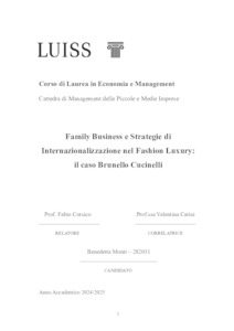 Monti, Benedetta (A.A. 2024/2025) Family business e strategie di internazionalizzazione nel fashion luxury: il caso Brunello Cucinelli. Tesi di Laurea in Management delle piccole e medie imprese, Luiss Guido Carli, relatore Fabio Corsico, pp. 58. [Bachelor's Degree Thesis]