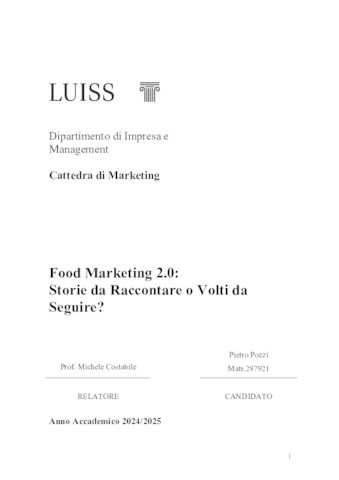 Pozzi, Pietro (A.A. 2024/2025) Food marketing 2.0: storie da raccontare o volti da seguire? Tesi di Laurea in Marketing, Luiss Guido Carli, relatore Michele Costabile, pp. 62. [Bachelor's Degree Thesis]