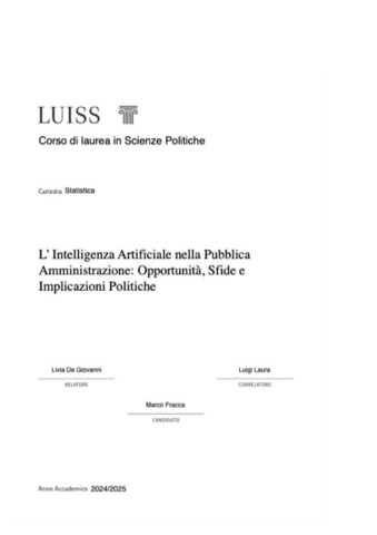 Fracca, Marco (A.A. 2024/2025) L'intelligenza artificiale nella pubblica amministrazione: opportunità, sfide e implicazioni politiche. Tesi di Laurea in Statistica, Luiss Guido Carli, relatore Livia De Giovanni, pp. 51. [Bachelor's Degree Thesis]