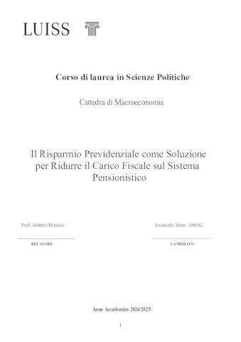 Testa, Leonardo (A.A. 2024/2025) Il risparmio previdenziale come soluzione per ridurre il carico fiscale sul sistema pensionistico. Tesi di Laurea in Macroeconomia, Luiss Guido Carli, relatore Alberto Petrucci, pp. 83. [Bachelor's Degree Thesis]