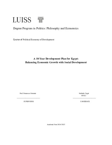 Togni, Nathalie (A.A. 2024/2025) A 10-year development plan for Egypt: balancing economic growth with social development. Tesi di Laurea in Political economy of development, Luiss Guido Carli, relatore Francesco Ferrante, pp. 95. [Bachelor's Degree Thesis]