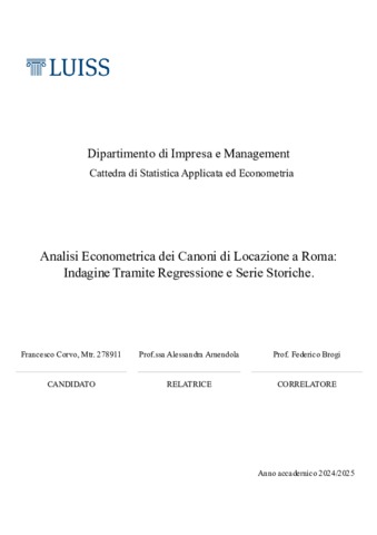 Corvo, Francesco (A.A. 2024/2025) Analisi econometrica dei canoni di locazione a Roma: indagine tramite regressione e serie storiche. Tesi di Laurea in Statistica applicata ed econometria, Luiss Guido Carli, relatore Alessandra Amendola, pp. 50. [Bachelor's Degree Thesis]