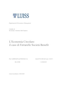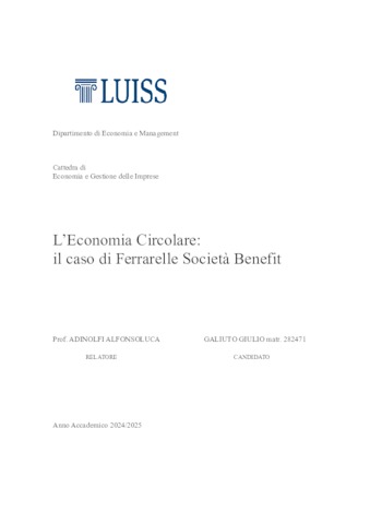 Galiuto, Giulio Agostino Maria (A.A. 2024/2025) L’economia circolare: il caso di Ferrarelle Società Benefit. Tesi di Laurea in Economia e gestione delle imprese, Luiss Guido Carli, relatore Alfonsoluca Adinolfi, pp. 57. [Bachelor's Degree Thesis]