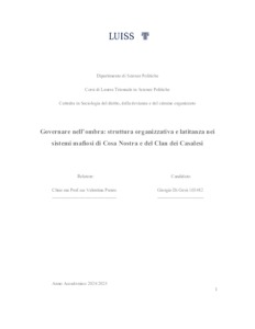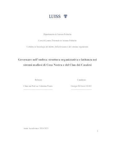 Di Gesù, Giorgio (A.A. 2024/2025) Governare nell’ombra: struttura organizzativa e latitanza nei sistemi mafiosi di cosa nostra e del clan dei Casalesi. Tesi di Laurea in Sociologia del diritto, della devianza e del crimine organizzato, Luiss Guido Carli, relatore Valentina Punzo, pp. 74. [Bachelor's Degree Thesis]