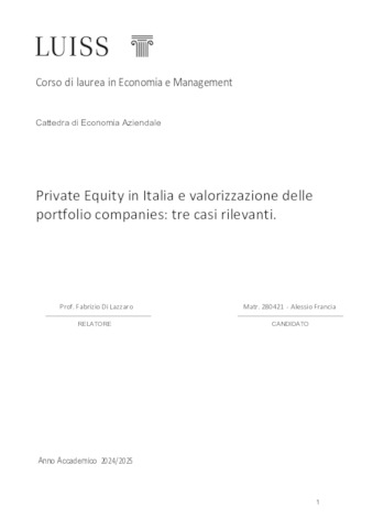 Francia, Alessio (A.A. 2024/2025) Private equity in Italia e valorizzazione delle portfolio companies: tre casi rilevanti. Tesi di Laurea in Economia aziendale, Luiss Guido Carli, relatore Fabrizio Di Lazzaro, pp. 61. [Bachelor's Degree Thesis]
