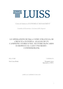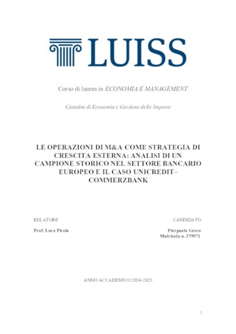 Greco, Pierpaolo (A.A. 2024/2025) Le operazioni di M&A come strategia di crescita esterna: analisi di un campione storico nel settore bancario europeo e il caso UniCredit–Commerzbank. Tesi di Laurea in Economia e gestione delle imprese, Luiss Guido Carli, relatore Luca Pirolo, pp. 80. [Bachelor's Degree Thesis]