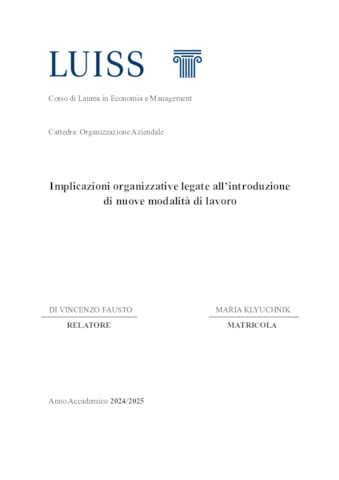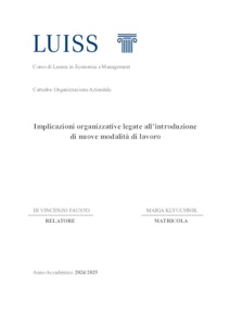 Klyuchnik, Maria (A.A. 2024/2025) Implicazioni organizzative legate all’introduzione di nuove modalità di lavoro. Tesi di Laurea in Organizzazione aziendale, Luiss Guido Carli, relatore Fausto Di Vincenzo, pp. 82. [Bachelor's Degree Thesis]