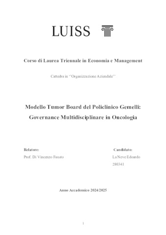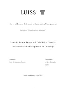 La Neve, Edoardo (A.A. 2024/2025) Modello tumor board del policlinico gemelli: governance multidisciplinare in oncologia. Tesi di Laurea in Organizzazione aziendale, Luiss Guido Carli, relatore Fausto Di Vincenzo, pp. 85. [Bachelor's Degree Thesis]