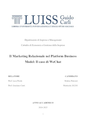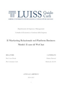 Perrozzi, Matteo (A.A. 2024/2025) Il marketing relazionale nel platform business model: il caso di WeChat. Tesi di Laurea in Economia e gestione delle imprese, Luiss Guido Carli, relatore Luca Pirolo, pp. 50. [Bachelor's Degree Thesis]