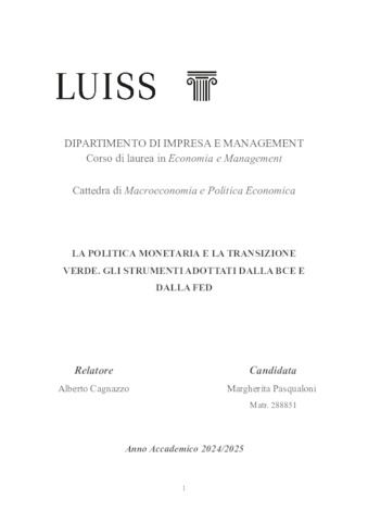 Pasqualoni, Margherita (A.A. 2024/2025) La politica monetaria e la transizione verde: gli strumenti adottati dalla BCE e dalla FED. Tesi di Laurea in Macroeconomia e politica economica, Luiss Guido Carli, relatore Alberto Cagnazzo, pp. 84. [Bachelor's Degree Thesis]